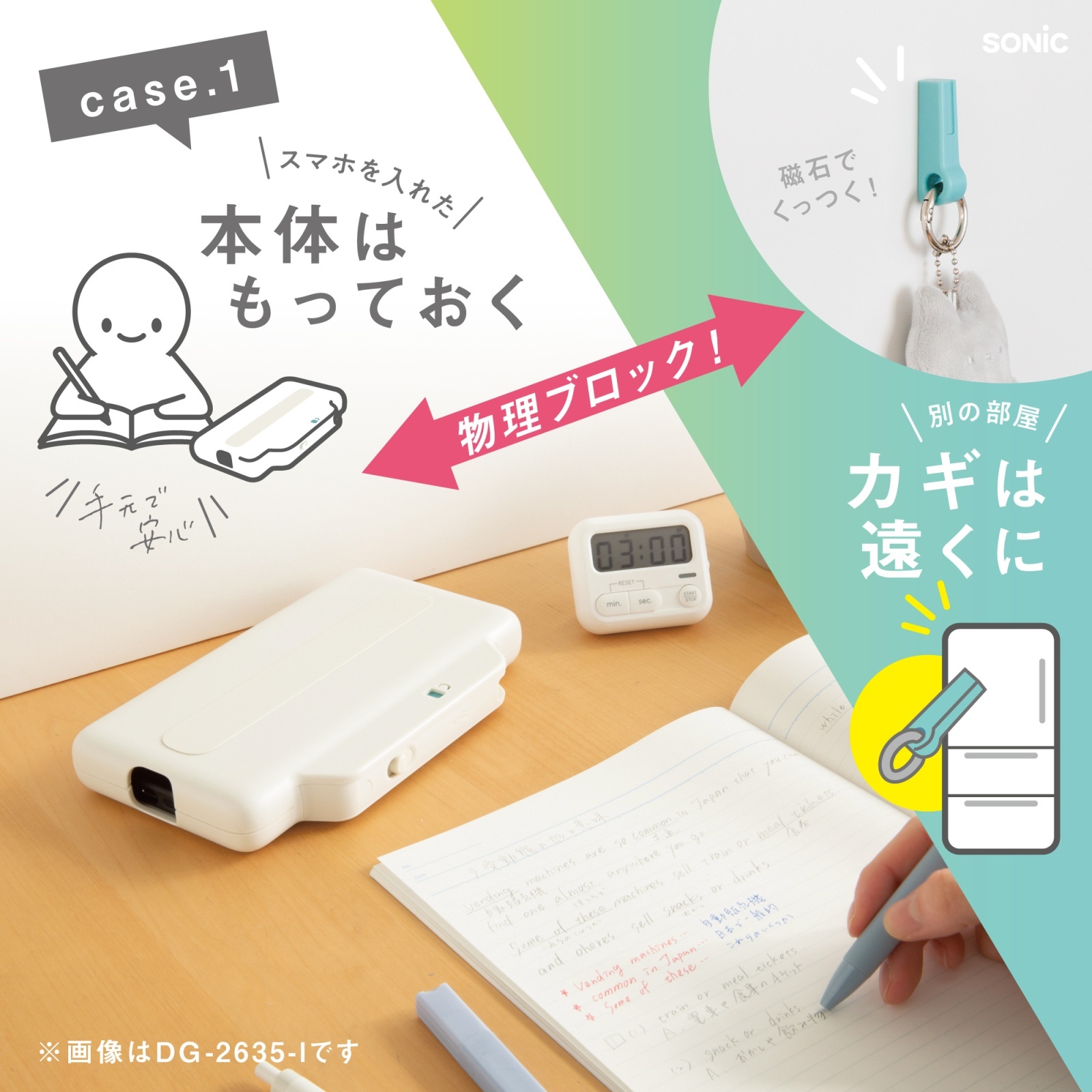 「カギはリビング」・「ケースは自室」など、別々に離して置くことで、スマホを触るまでに時間がかかる環境を作れます。